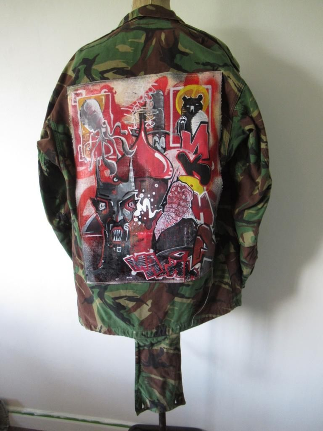 Hand Painted Canvas back-piece on an upcycled Camouflage Jacket by Uvawrld.