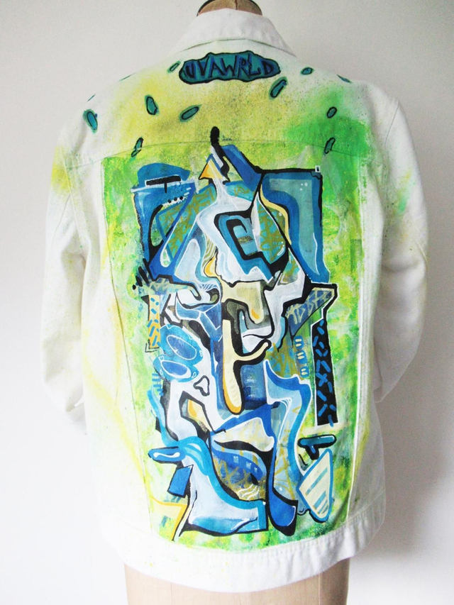 Hand Painted White Denim Jacket featuring an original Uvawrld design. A one off Abstract piece with crystal inspiration.