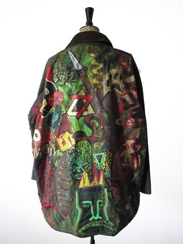 A Vintage Barbour Wax Jacket taken to the Uvawrld and transformed with a Punky - Reggae Paint job celebrating the influence of roots music in urban Britain.