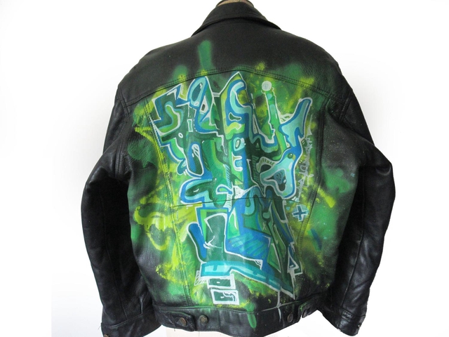 A Leather Bomber Jacket taken to the Uvawld and given a funky flavoursome new design. Hues of red green and turquoise in an abstract composition that beams with underwater energy