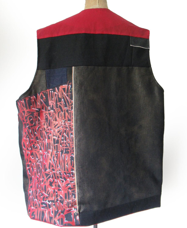 The Cirrina is a sleeveless jacket combining waxed Cotton and denim. This particular piece has been enhanced with a hand painted leather panel capturing words from the legendary Spaceape.