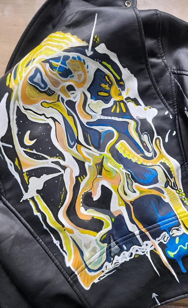 An Uvawrld archway piece hand painted on an cruelty-free biker jacket. One of many architecturally inspired pieces captured on a wearable canvas.